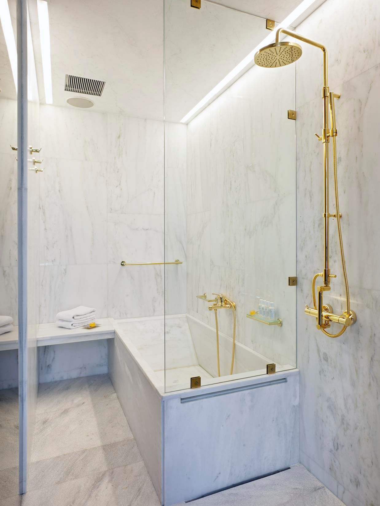 Designed to perfection, the spacious penthouse suite encapsulates the Campana aesthetic in all its 65 square meters. Every piece of furniture, every fixture and furnishing, even the custom-made carpet has been handpicked to create a sense of understated yet unsurpassable exclusivity. Each space is meticulously designed to maximize comfort, with separate sleeping room and living room areas. Entirely cast from marble, the bathroom adds to the plush effect. The suite has a large terrace which appears to be embracing the city below, affording 360° views of all the historical landmarks, including the Acropolis and the Lycabettus Hill.