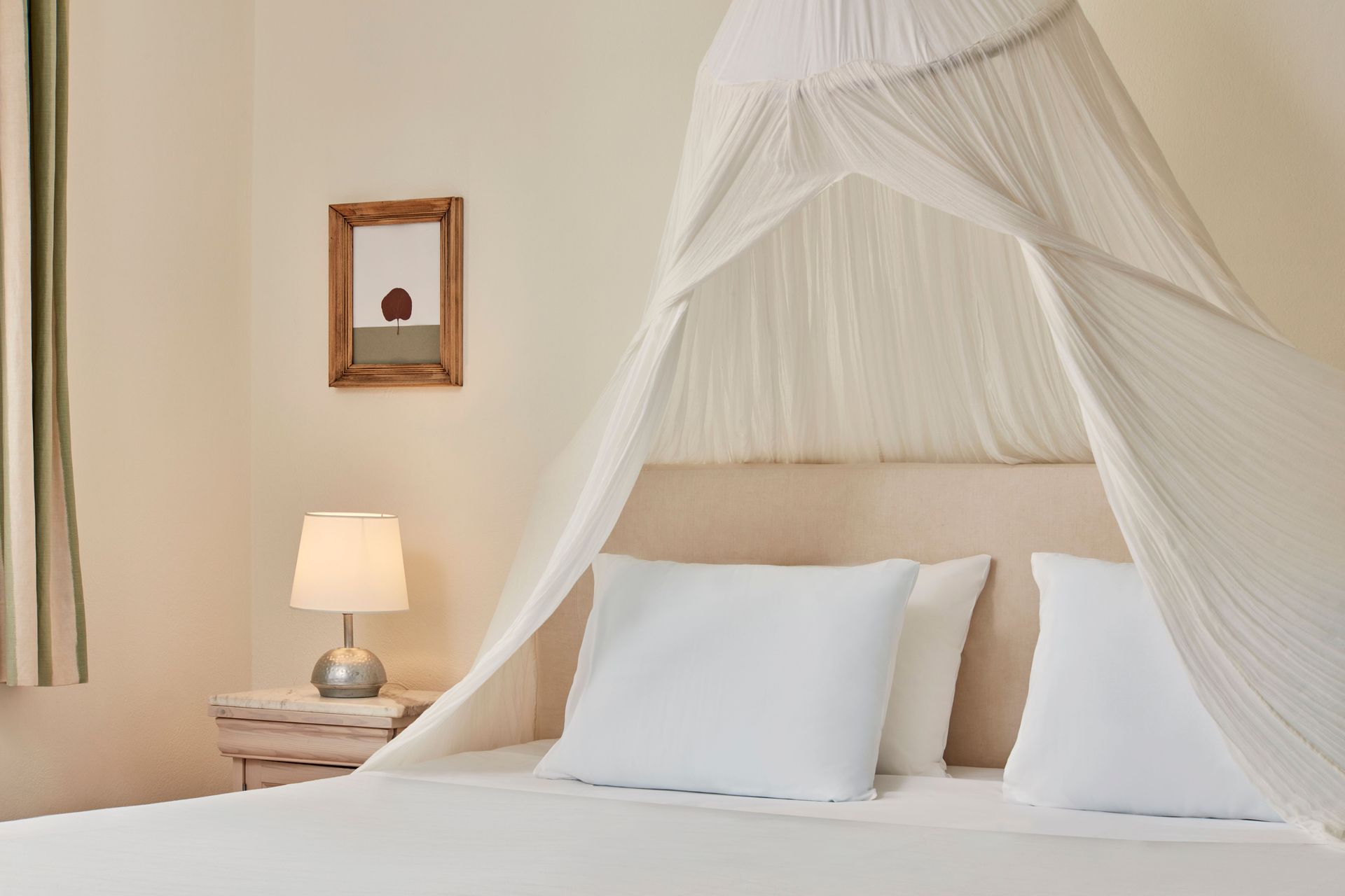 Featuring balconies that overlook the calming sea below, contemporary Serenity Suites are perfectly positioned on the seafront to allow guests to make the most of their family island vacation. The open-plan design of the living room and fully-equipped kitchenette blends the modern aesthetic of exposed brick with earthy tones in understated elegance, providing top-notch amenities to fulfil all the wishes of today’s traveler. With a queen-sized bed in the fully secluded bedroom and two sofa beds in the lounge, the suite accommodates four guests comfortably, and also includes an outdoor terrace.