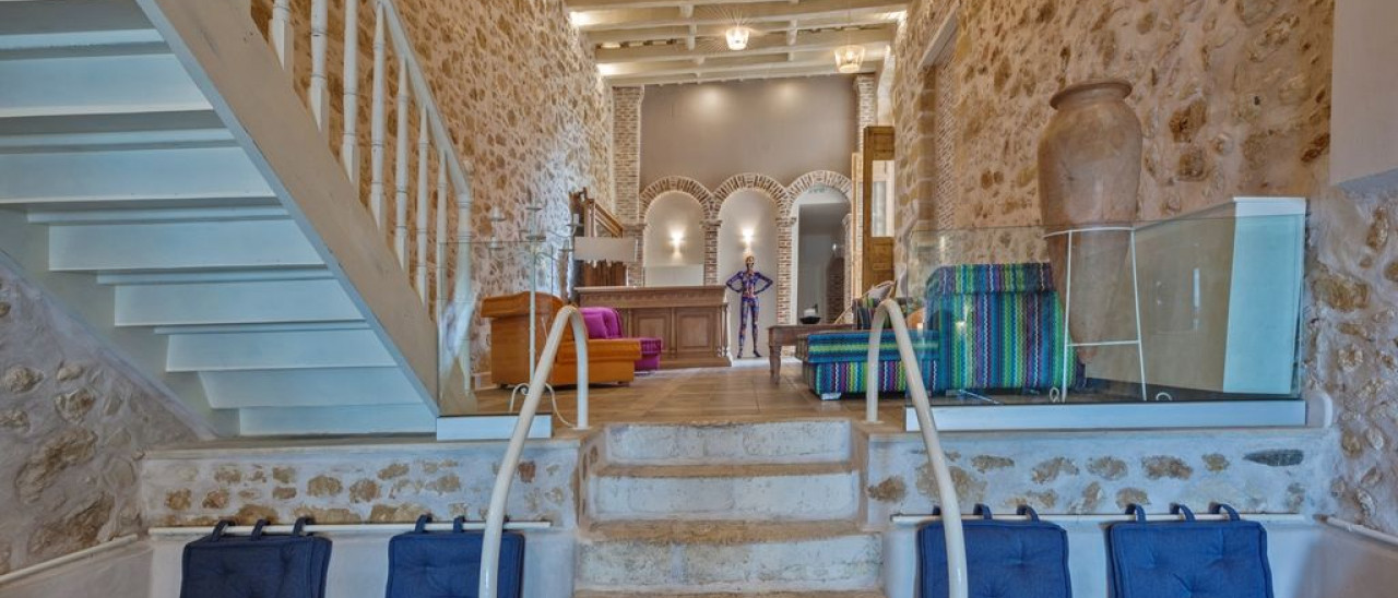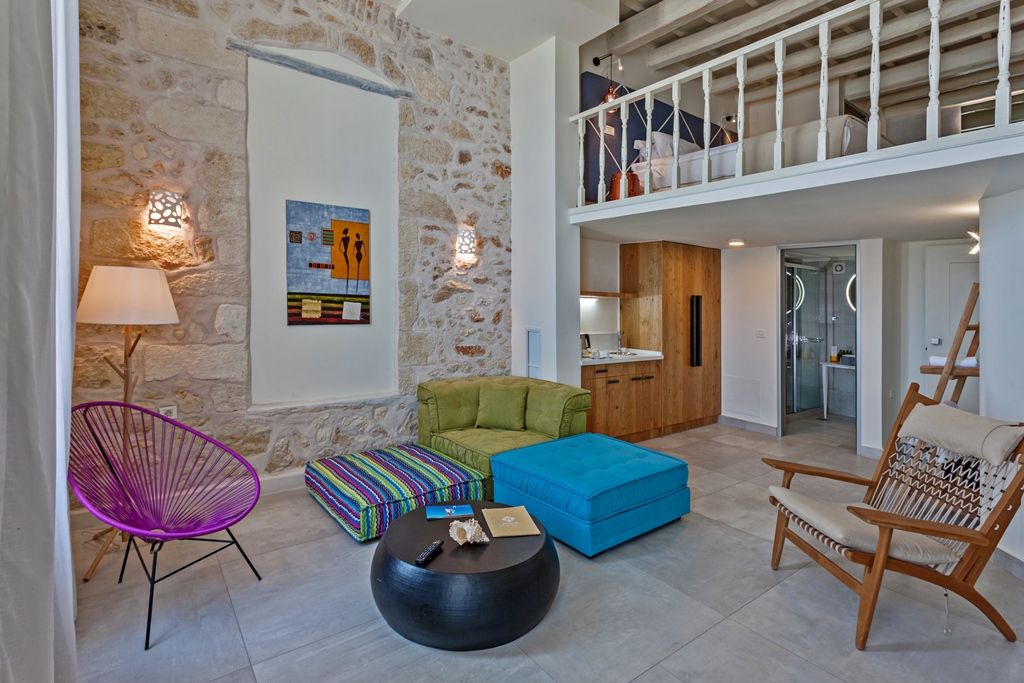 A sea view suite with a double bed and a large balcony overlooking at the Fortetzza Fortress