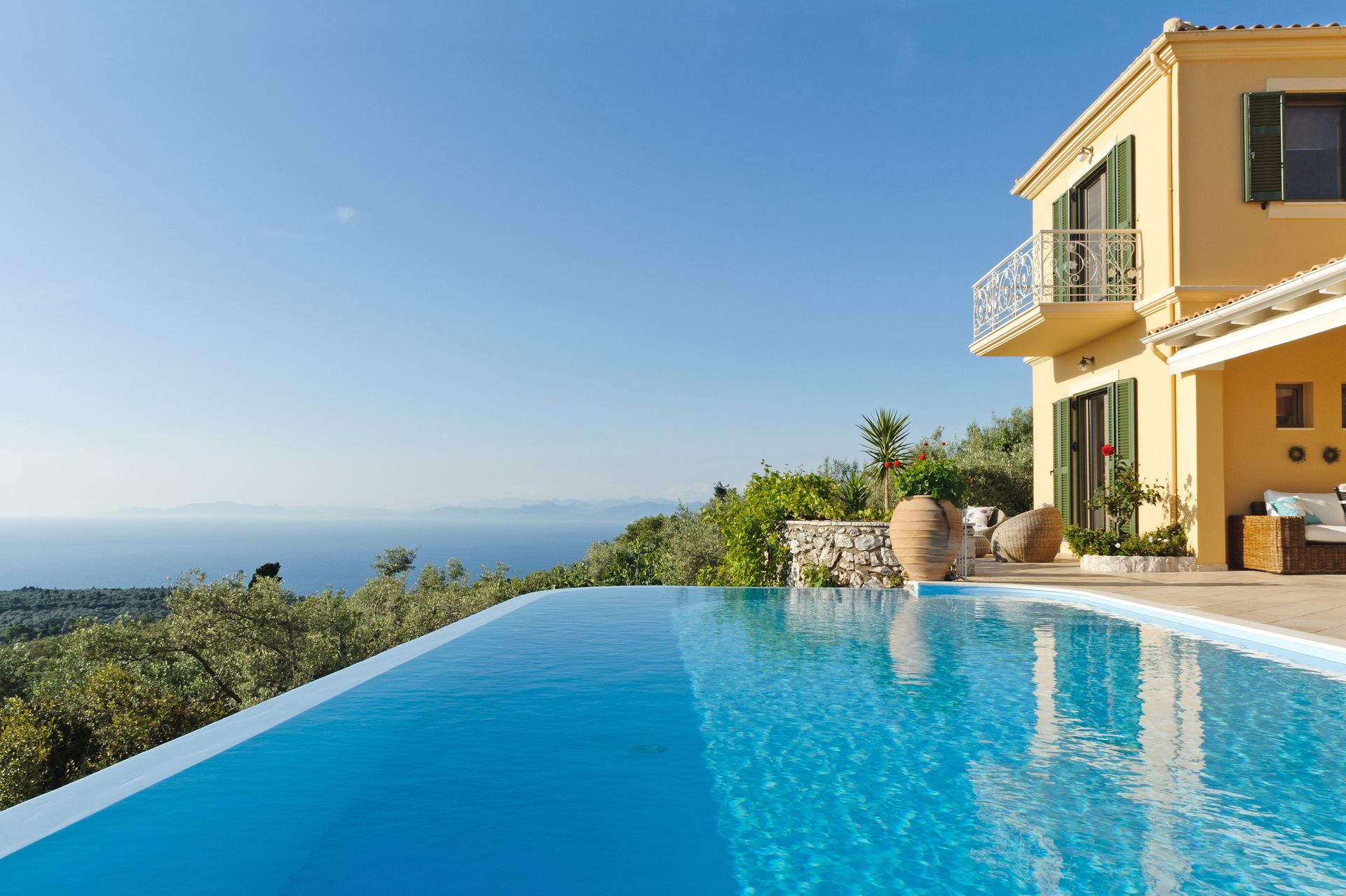 The villa is mainly made of wood, marble, granite and earth tones that complement the surrounding natural world. Traditional carpenters have poured all their skill and dexterity in building the furniture you will enjoy.On the ground floor you will find a spacious, welcoming living room, a fully equipped kitchen decorated with style and skill and a comfortable bedroom with 2 beds, bathroom and shower. On the top floor a master bedroom awaits, with an en-suite bathroom, a Jacuzzi and a balcony, from where you can gaze at the spectacular Ionian view every morning.The outdoor spaces are framed by stone walls and boast a wonderful yard with ceramic flooring in earth tones, a variety of flower beds and a roofed balcony-dining room where you can enjoy your homemade meals prepared by yourselves in your traditional wood-fired oven.The final touch is the blue water of the large swimming pool that becomes one with the horizon and the endless blue of the Ionian Sea. More...
