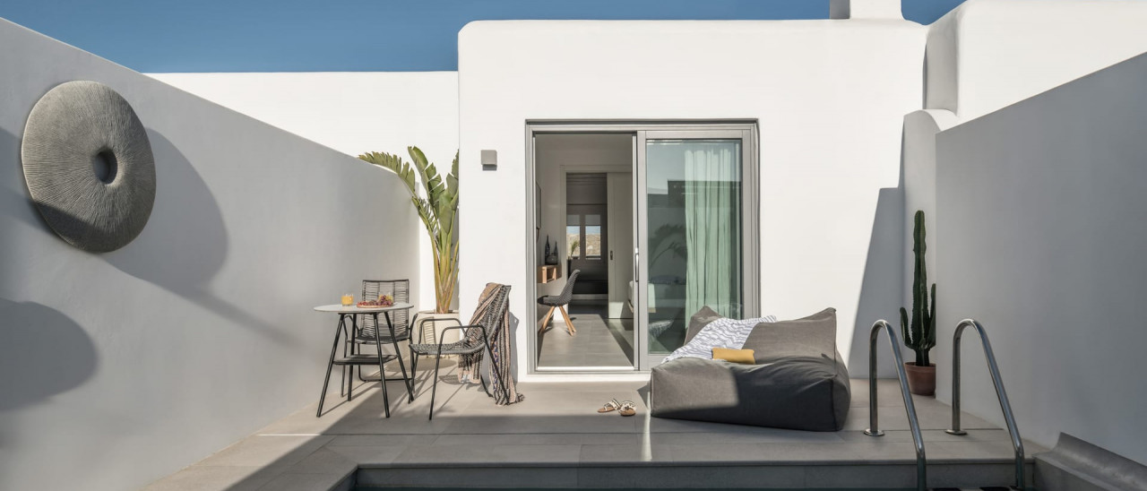 Located next to the crystal clear pool on the ground floor, the rooms combine elegant contemporary design with absolute comfort. Decorated with muted Mediterranean colours and boasting a typical Cycladic white wooden ceiling, the beautifully designed rooms match the island?s sophisticated vibes? energy and vitality.