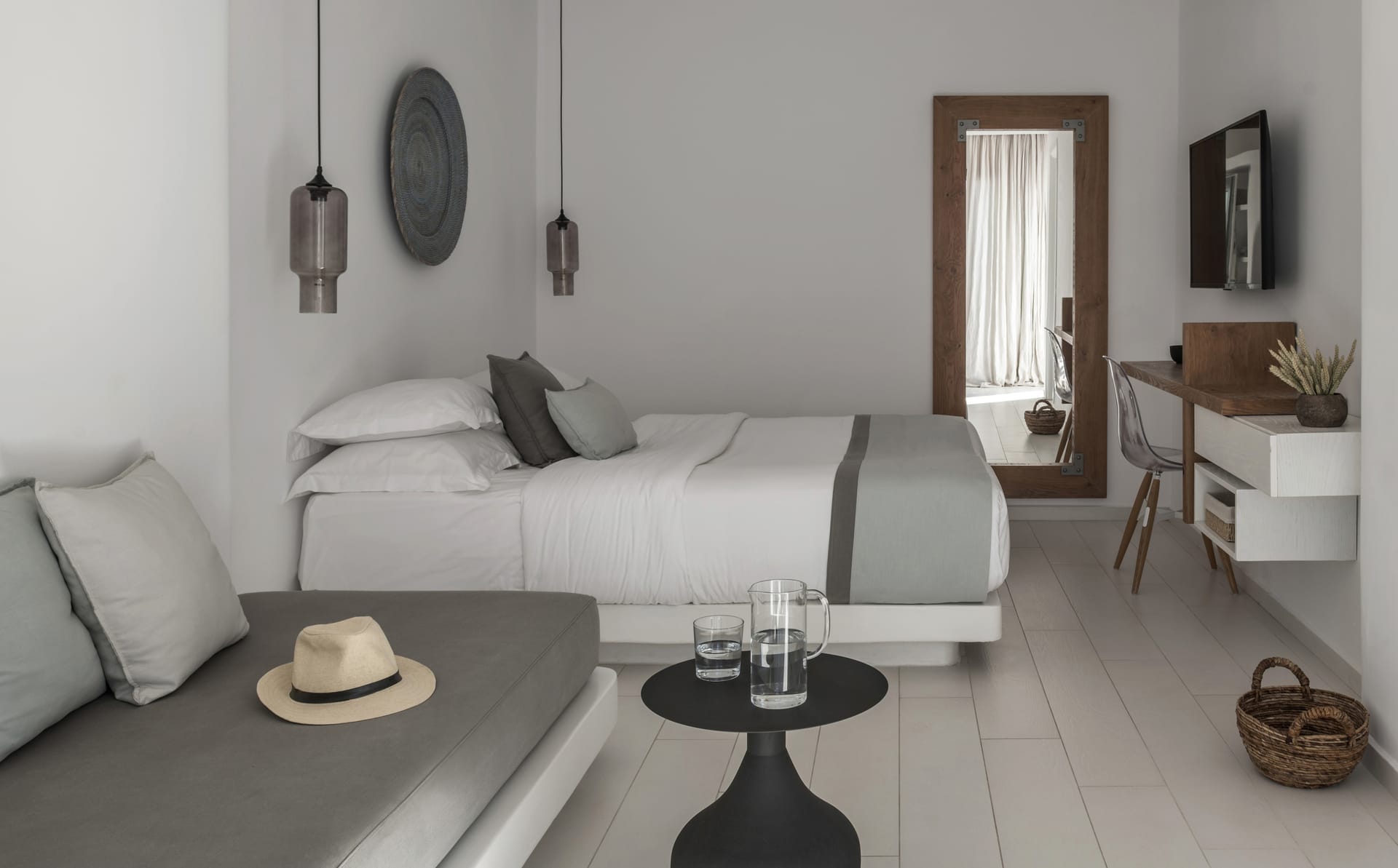 Located on the hotel’s upper level, the 60sqm Executive Suite offers from its private balcony a totally panoramic view over the Myconian countryside and the crystal turquoise color pool. Following the total white of the Mediterranean sun on its furnishings, the Suite reflects a spirit of simplicity and earthy craftsmanship.