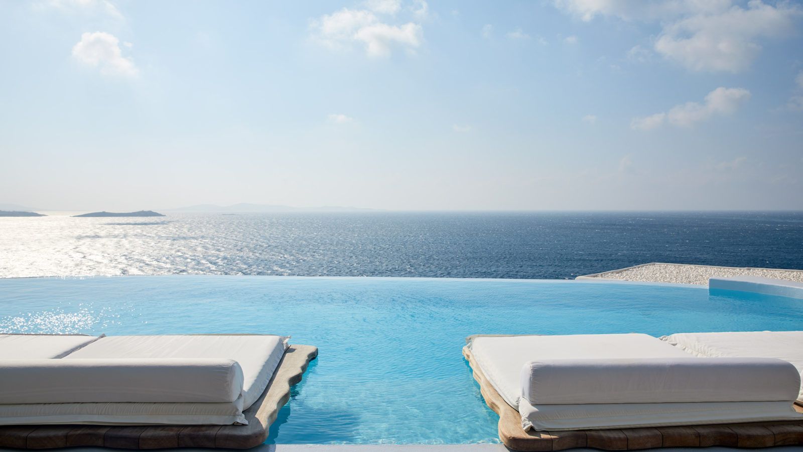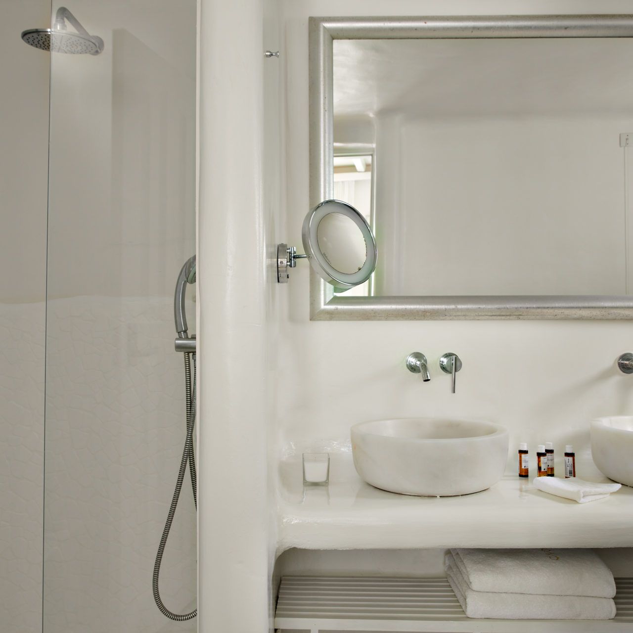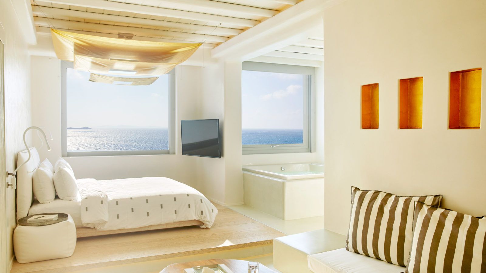 A magical retreat dedicated to revitalizing the mind. The enchanting Superior Rooms, with plunge pool on the balcony, overlook the marvelous blue of the Aegean Sea. Fusing the Cycladic style with modern aesthetics, the designer deco uniquely blends Mykonian philosophy with ultimate luxury. Whitewashed walls, vivid splashes of color, plush four poster queen sized bed, revitalizing Jacuzzi tub, all combine to make a cool and calming statement. An idyllic space to soak up the pleasures of Aegean beauty.