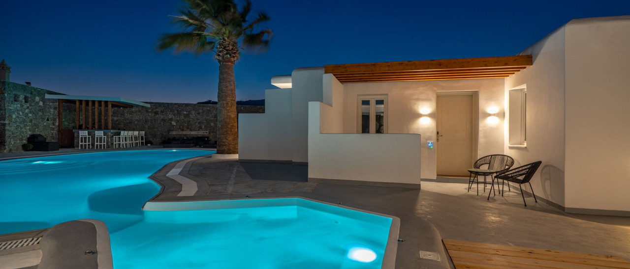 With plenty of floor space, the lavish Omnia suite, offers cutting edge style and comfort in the lap of luxury, in true Mykonos style, for up to four guests. Distinctly airy and chic the Omnia luxury suite in Ornos, is the biggest of the lot, ideal for spreading out in. It moreover comes with a commodious terrace as well as enchanting pool views, for ultimate relaxation and indulgence. Sporting state of the art amenities including a Satellite TV, Docking Station or Espresso Coffee Maker, the Omnia Ornos luxury suite is moreover great for longer stays on the island of Mykonos. More...