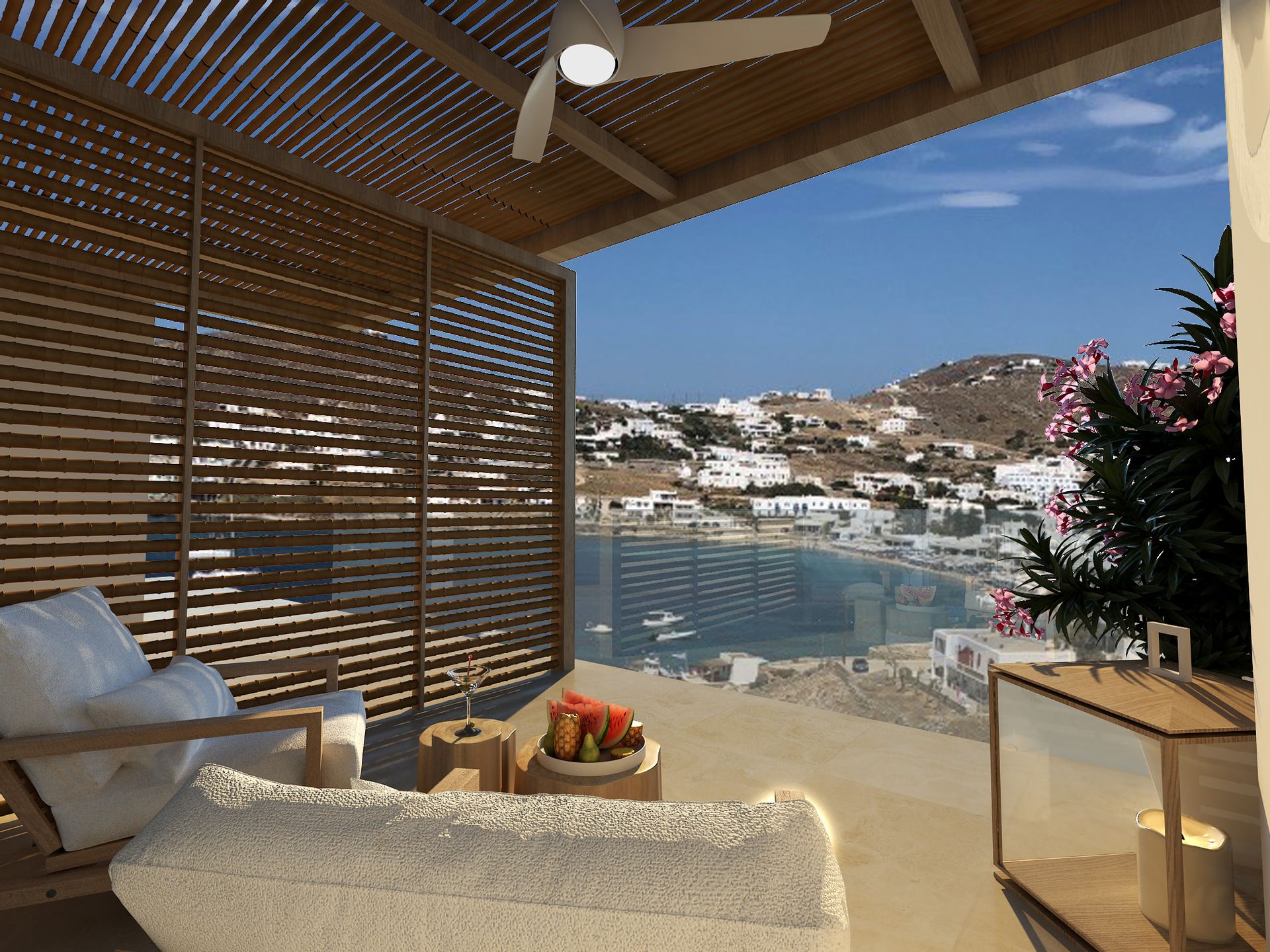 The feeling of extra space, inside and out, as well as a sweeping view of Ornos Beach, are only a few of the features that set our Junior Suite Sea View (30-34 sq.m.) apart as the ultimate destination for a getaway on Mykonos! Its open-plan inner area includes a blissfully comfortable king-size bed in which to dream of unforgettable moments on the island, set adjacent to a window that lets in refreshing natural vistas. The terrace is part of the experience, equipped with comfortable chairs in which to lounge and while the day away, or enjoy a fabulous room-service breakfast.