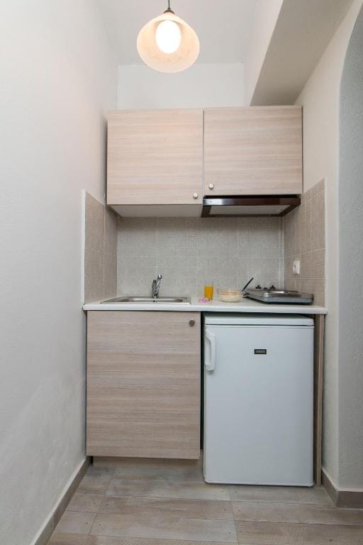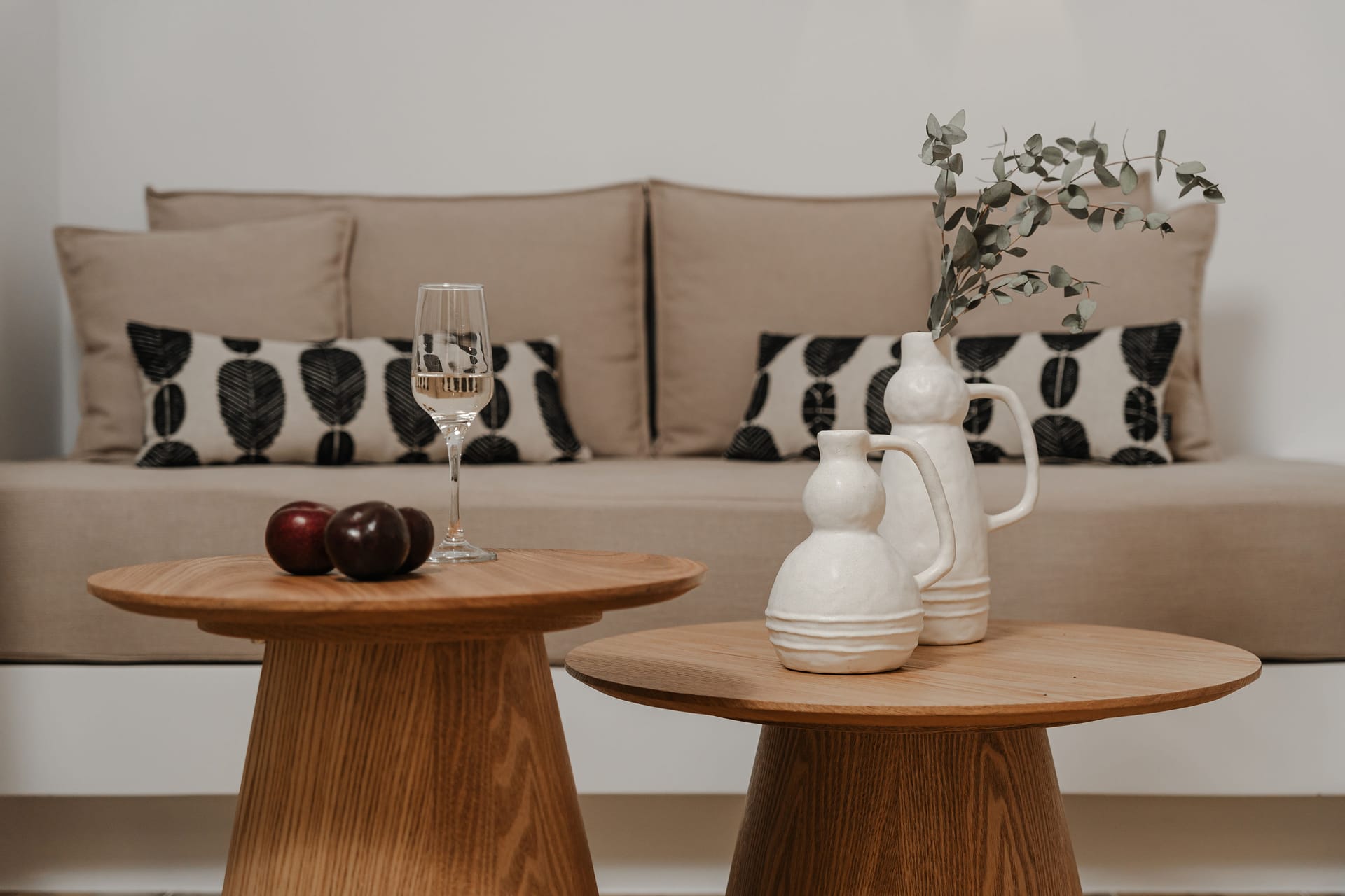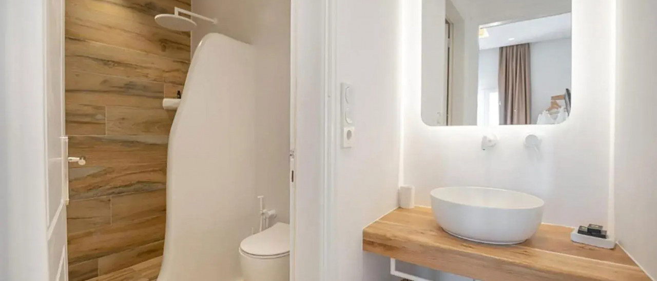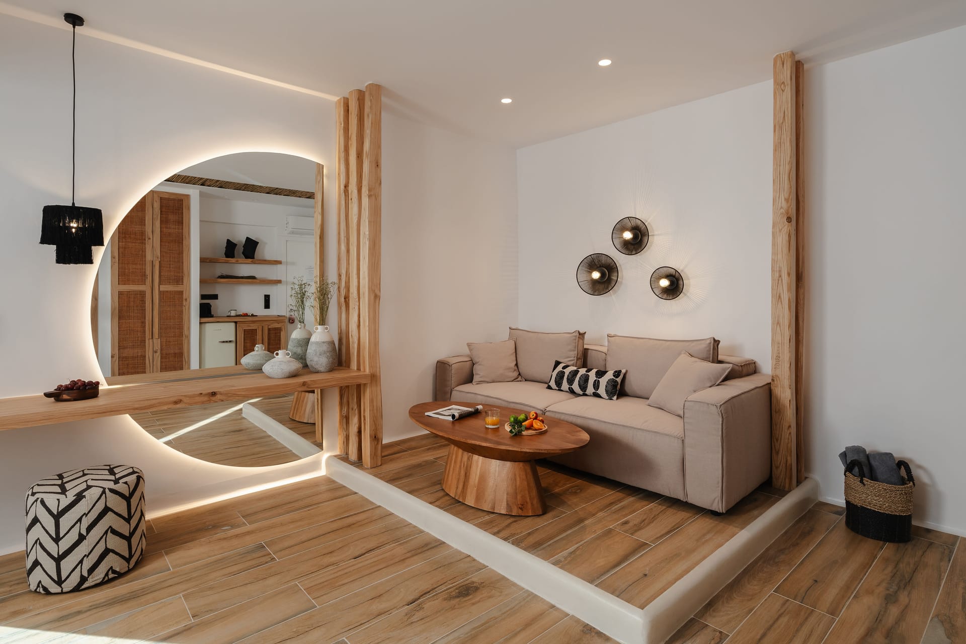 The 24 sq.m. Superior Apartment stands out for its thoughtful design, combining functionality and style while accommodating up to three guests. A modern wooden divider separates the living area from the bedroom, creating privacy without compromising natural light, while the television placed opposite the bed enhances the relaxation experience.