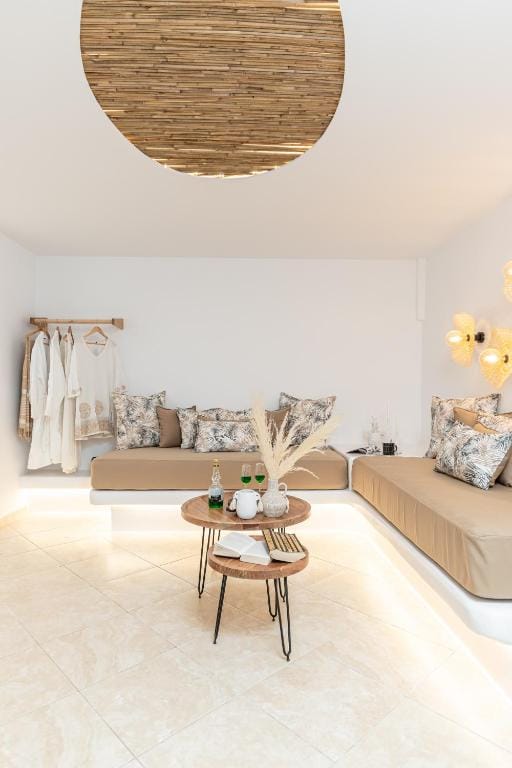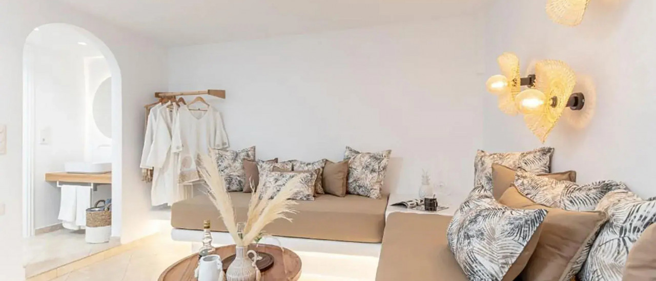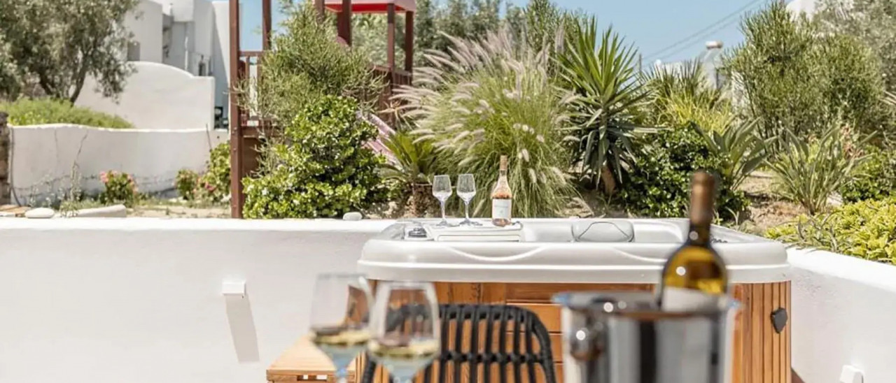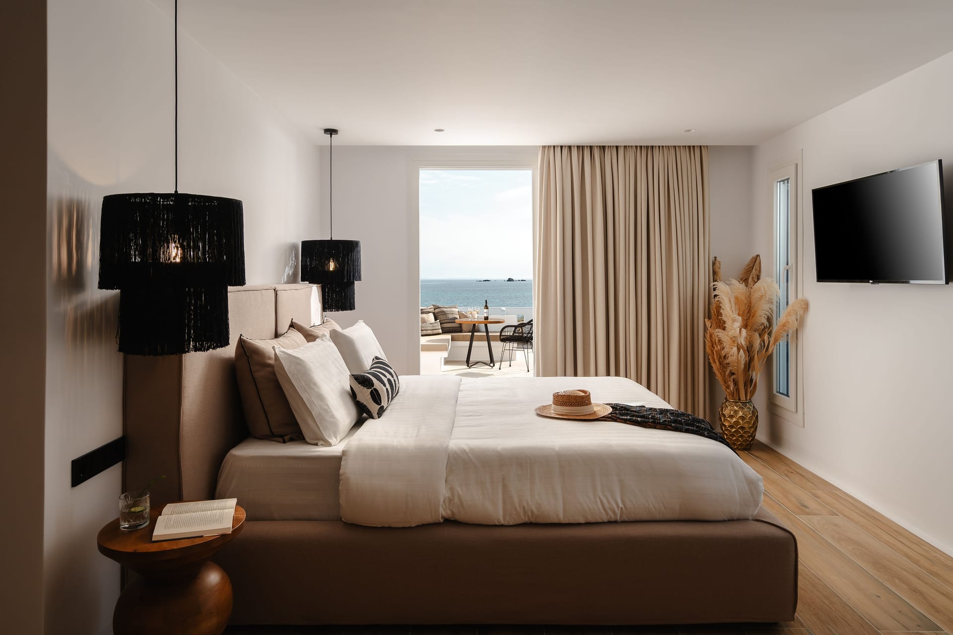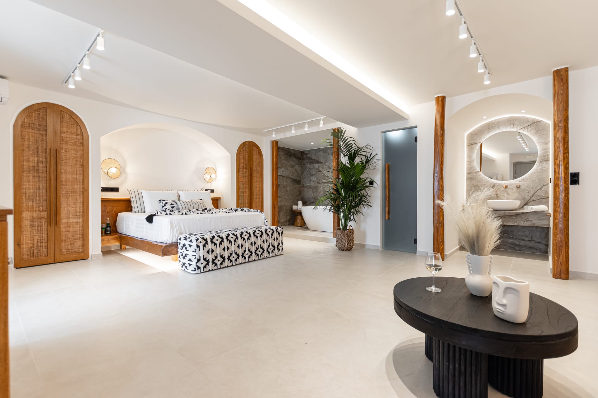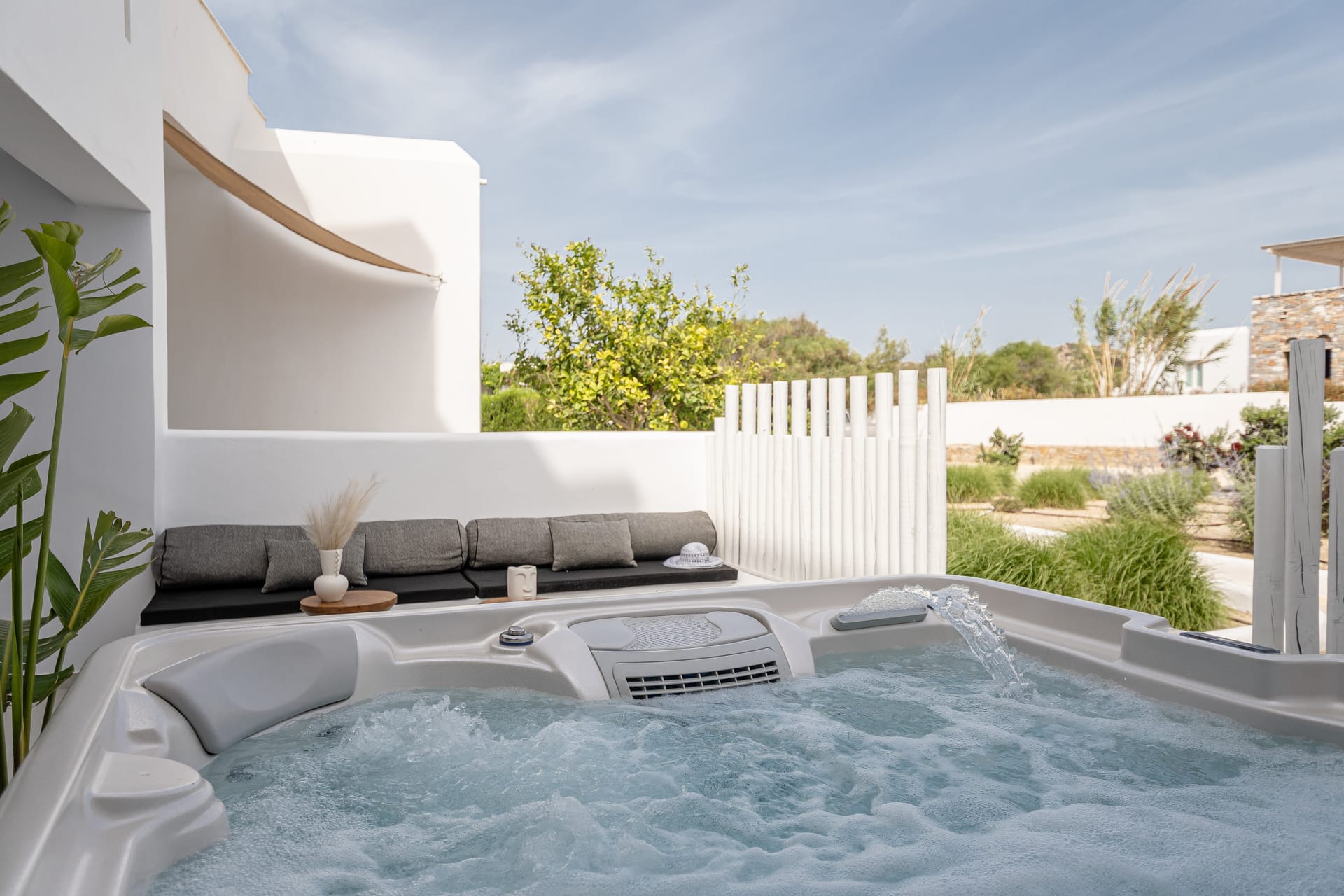 Experience the ultimate stay in the Premium Jacuzzi Suite Sea View, ideally set on a higher floor to offer unobstructed views of the Aegean from its spacious veranda. Covering approximately 40 sq. m., this suite accommodates up to 2 guests, serving as a romantic escape or a serene retreat for those seeking relaxation.
