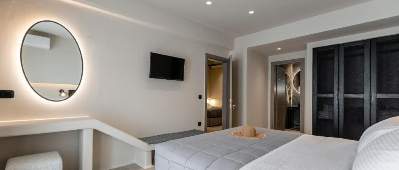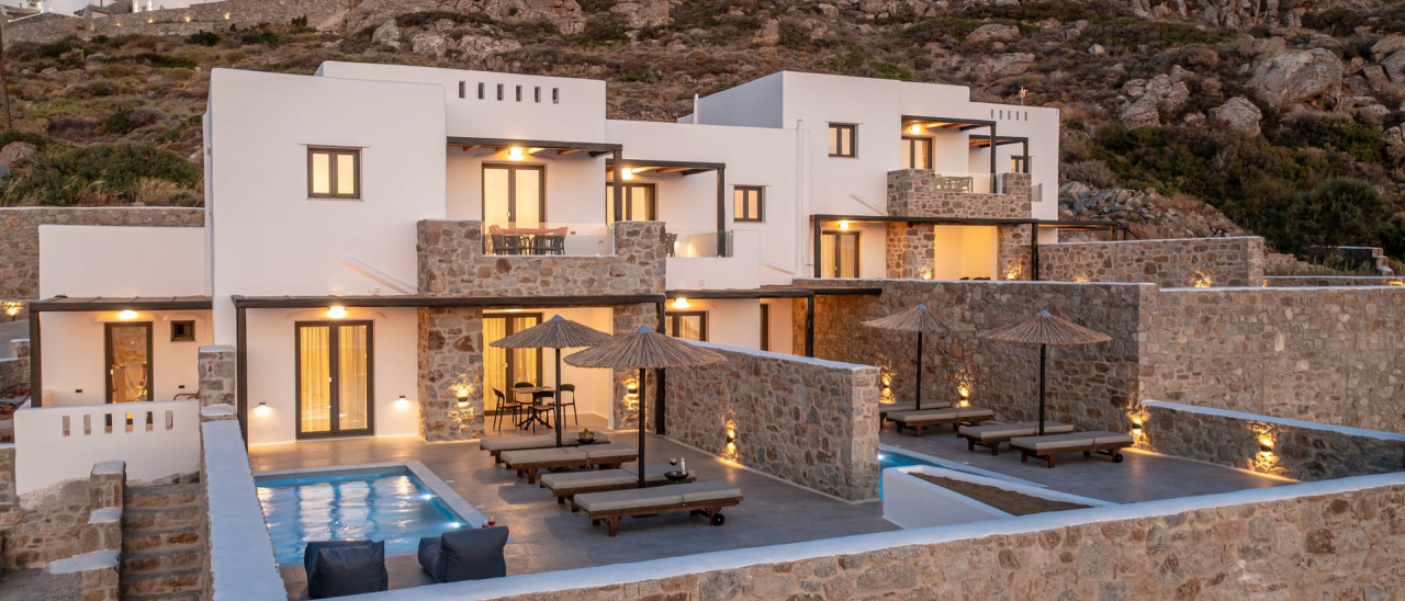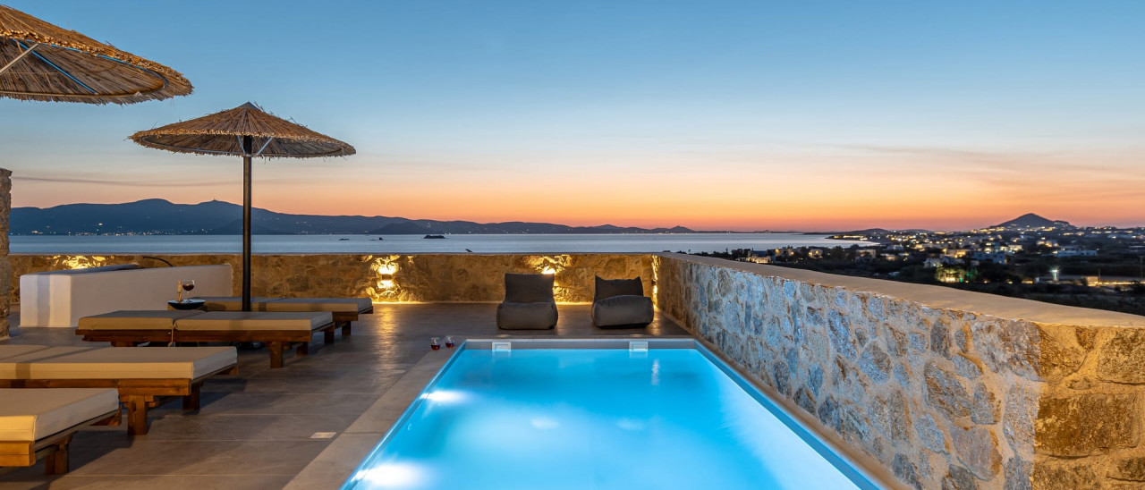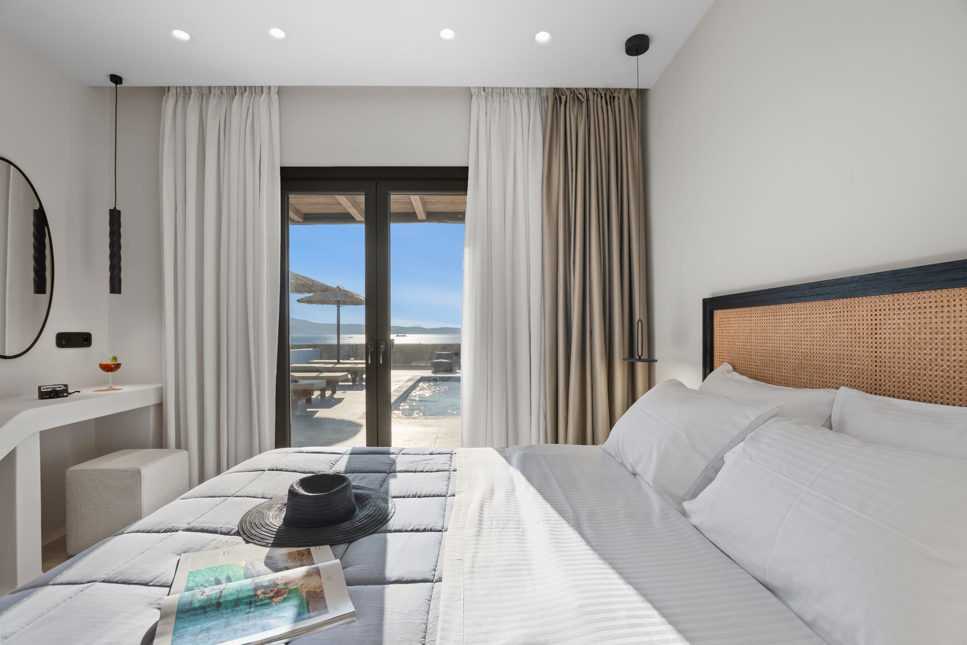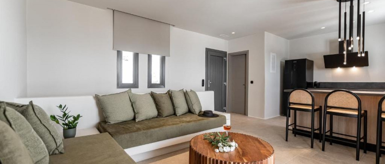 The outdoor area features a private swimming pool, sun loungers, and a shaded dining terrace—ideal for relaxing under the Greek sun or enjoying al fresco meals. With Cycladic architecture and modern comforts, this villa combines island charm with luxurious amenities.