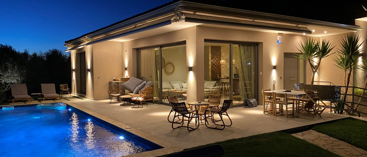 Elaia Grove Includes two independent villas, 110 and 90 sq.m. respectively, in contemporary and boho style, each one of them with a private pool and terrace, private parking, and an independent entrance.